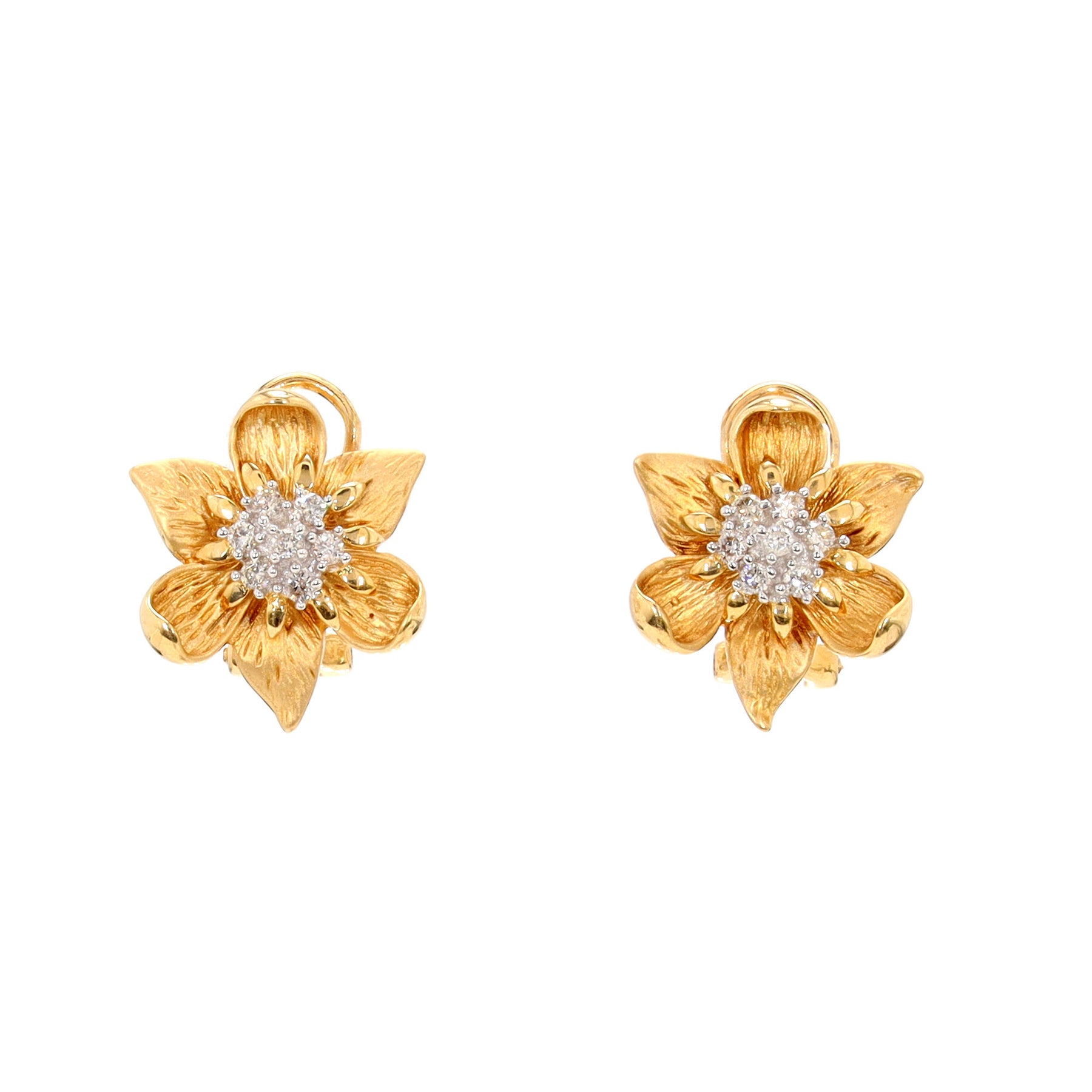 Floral omega back earrings in 14-karat yellow gold featuring 14 diamonds with a combined weight of approximately 0.20 carats.