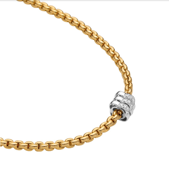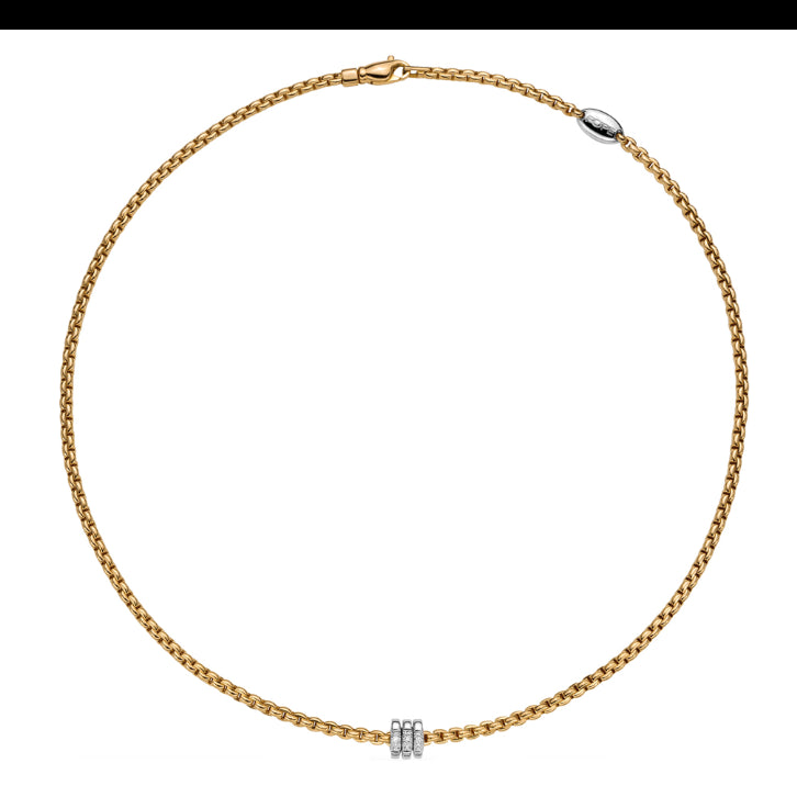 18 carat gold necklace with 0.16ct F/G VS diamonds on three movable stations.