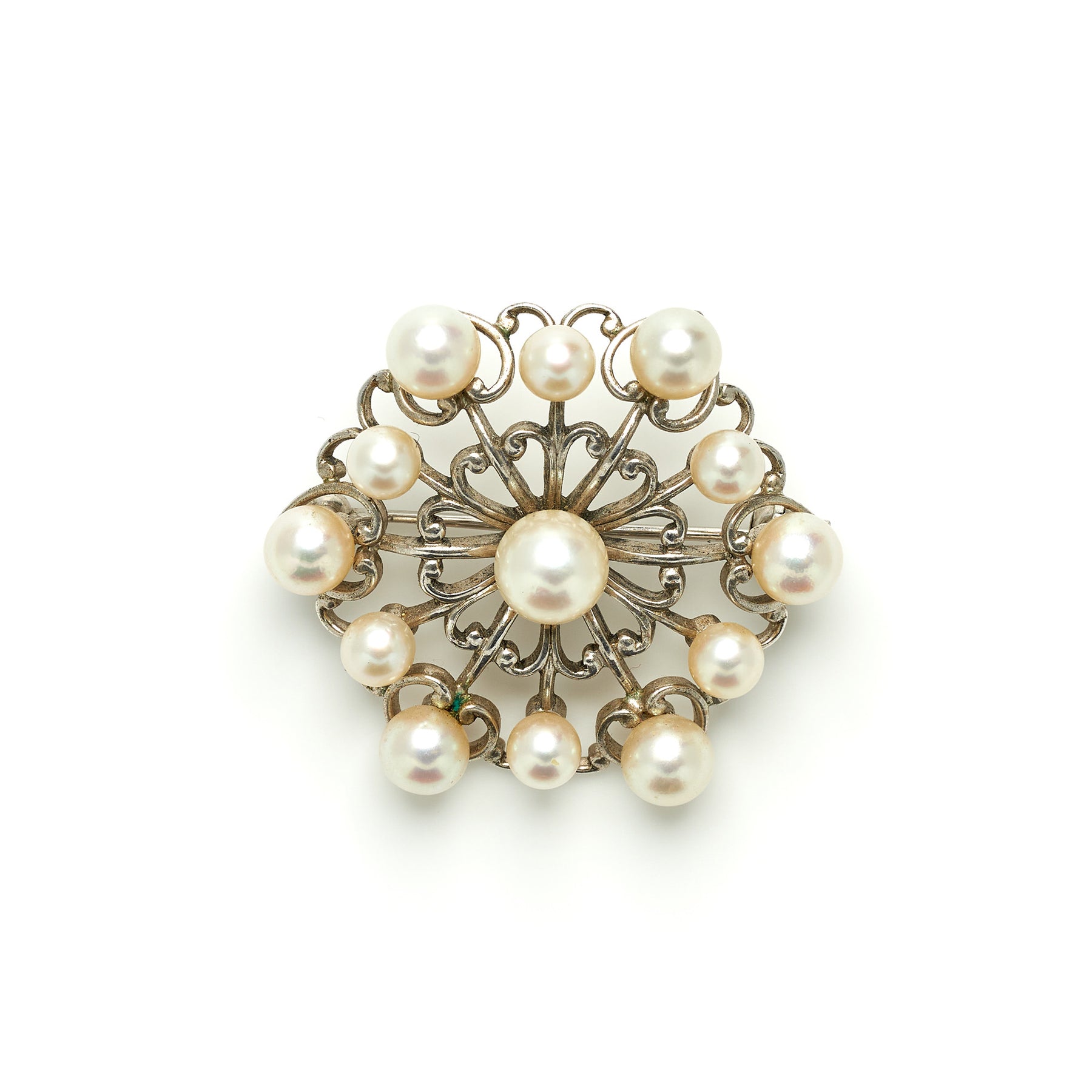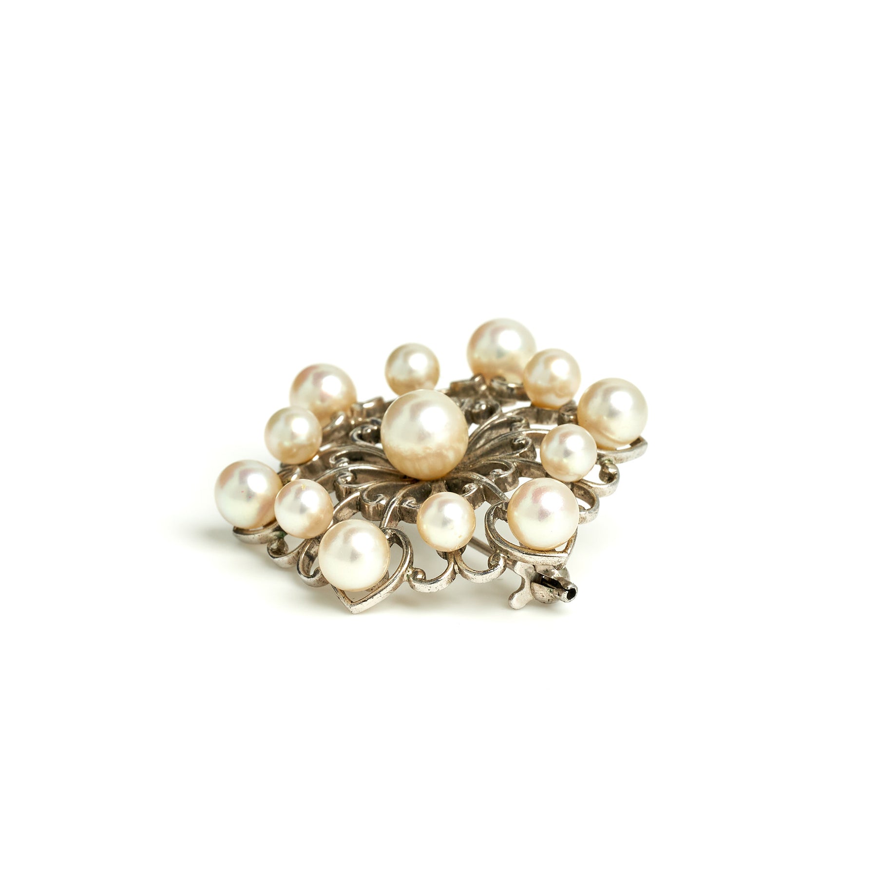 Mid-20th century "Mikimoto" pin in sterling silver featuring 13 akoya pearls measuring 4.45-6.90mm in length.