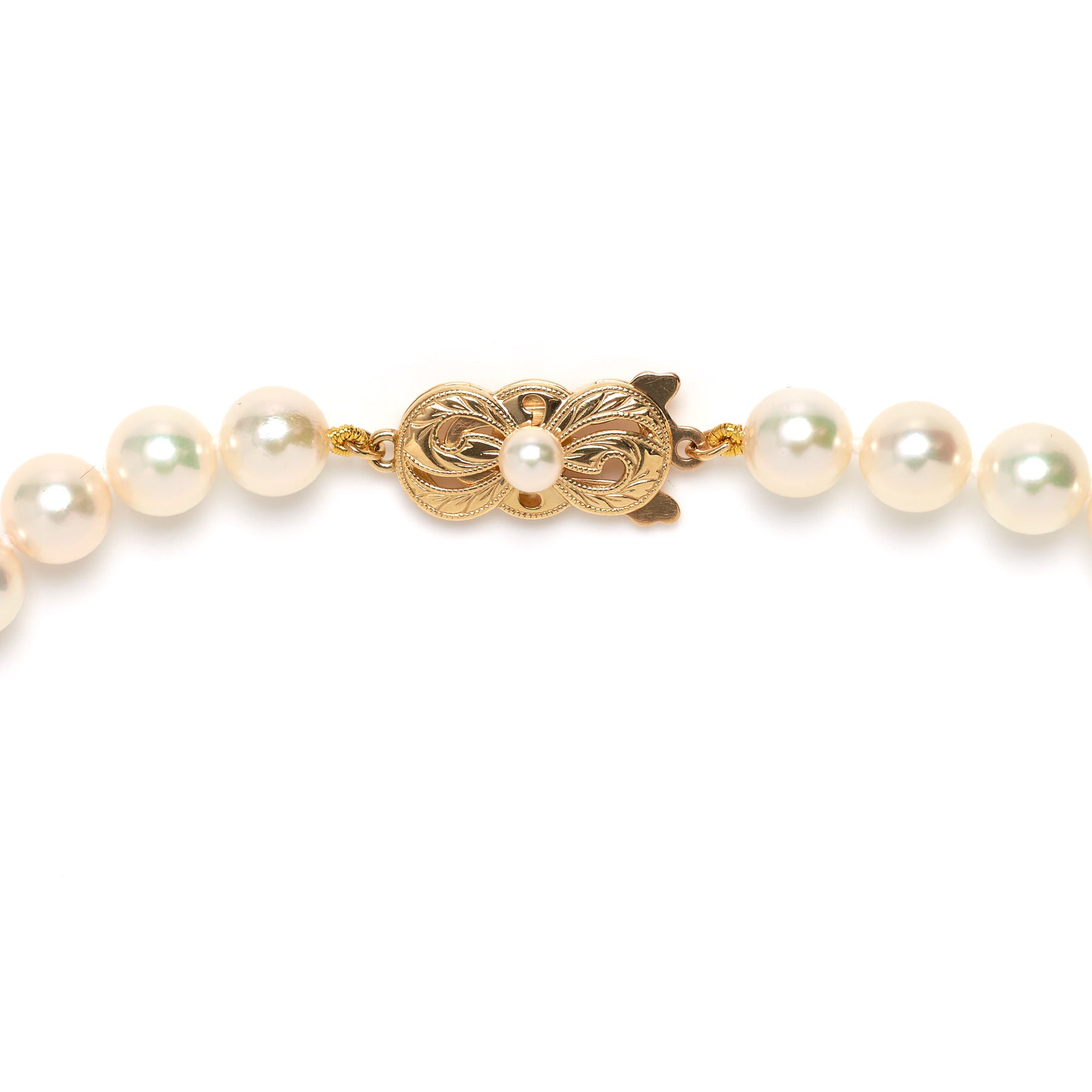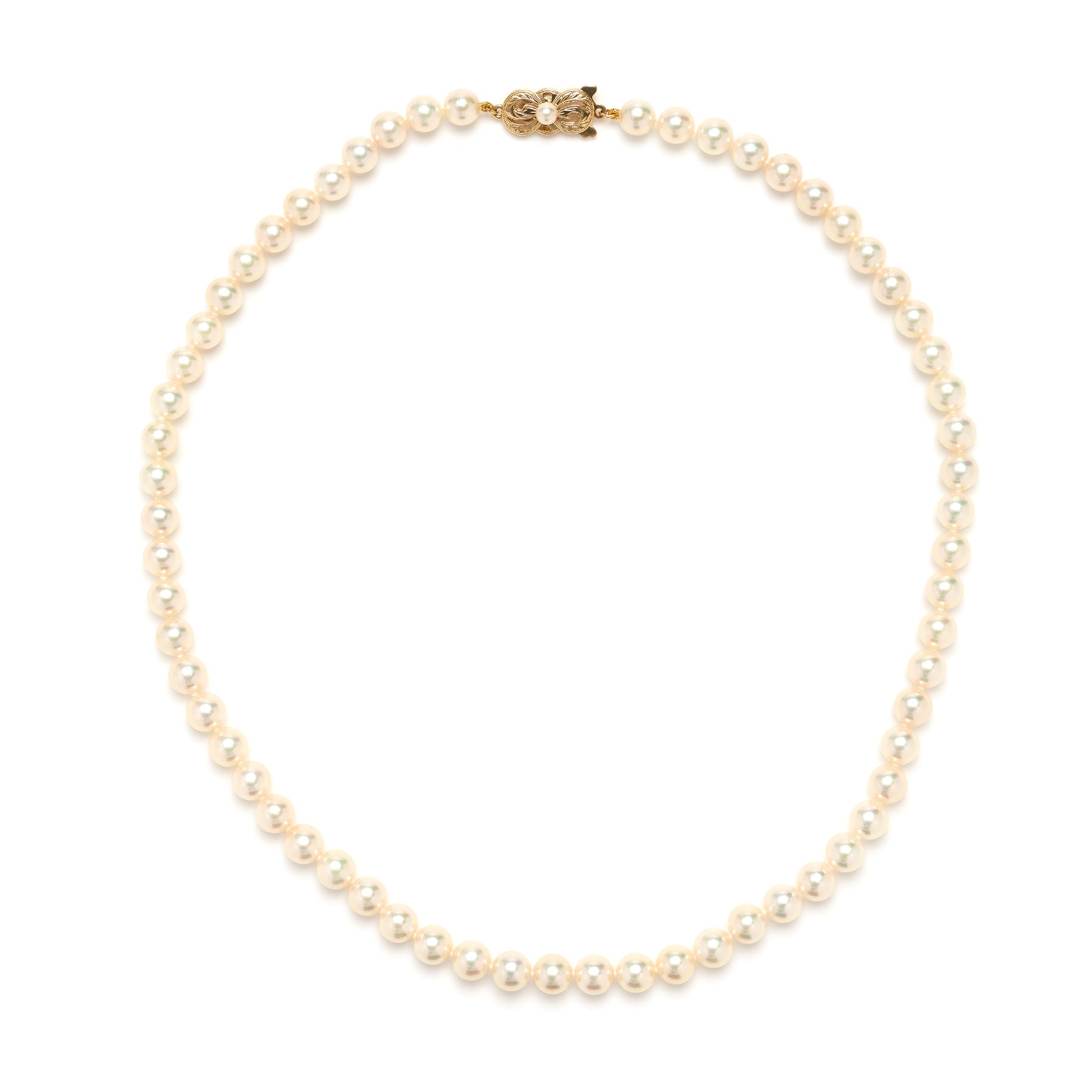 "Mikimoto" strand measuring 18" in length with an 18-karat yellow gold clasp featuring 62 akoya pearls measuring between 6.5-7.0mm. Includes box.
