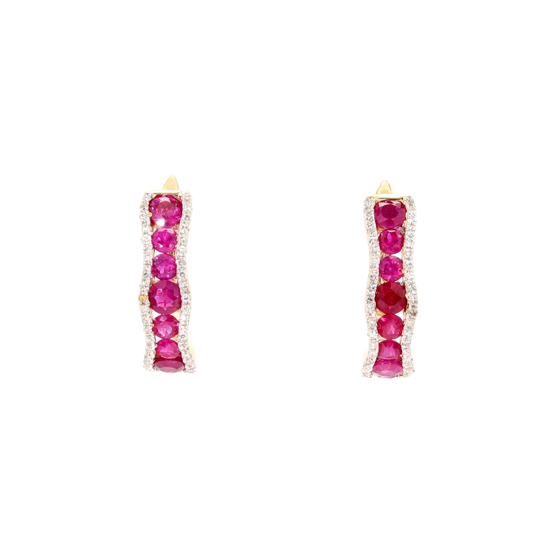 Hinged hoop earrings in 14-karat yellow gold featuring 16 rubies with a combined weight of approximately 1.60 carats and 80 diamonds with a combined weight of approximately 0.21 carats.