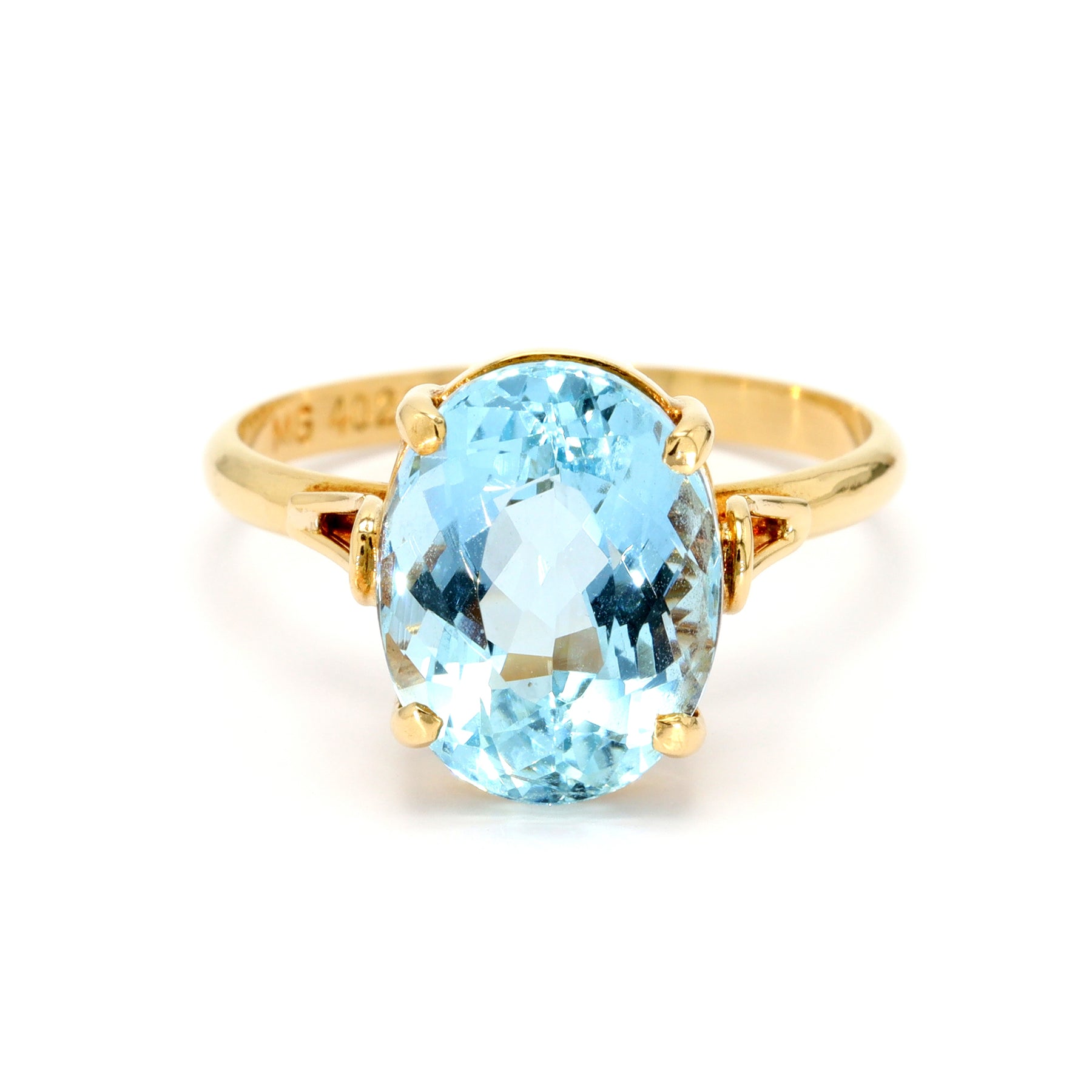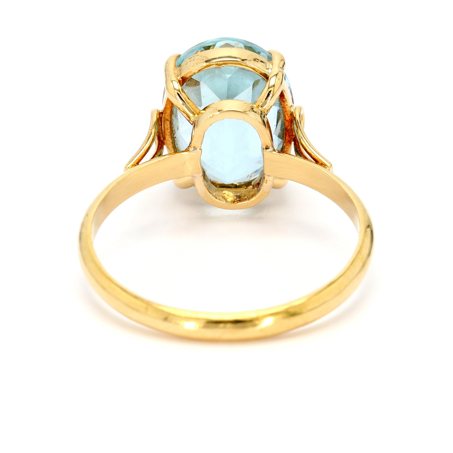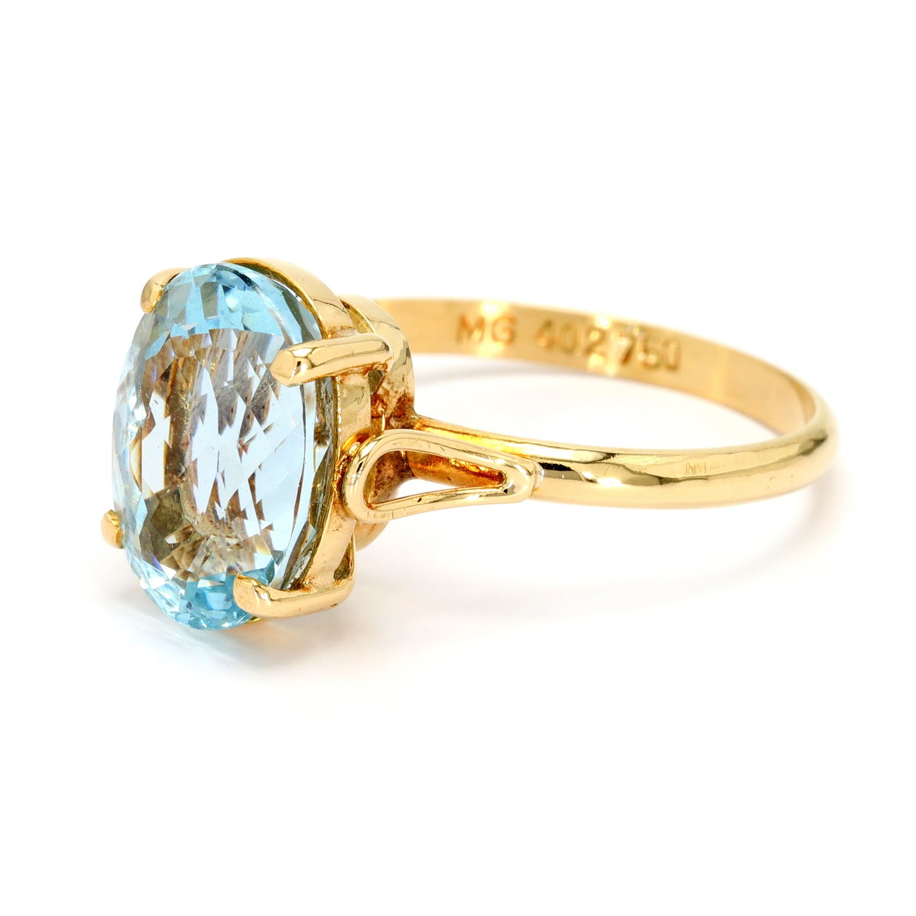 Solitaire fashion ring in 18-karat yellow gold, size 6.5, featuring 1 faceted oval aquamarine weighing approximately 3.80 carats.