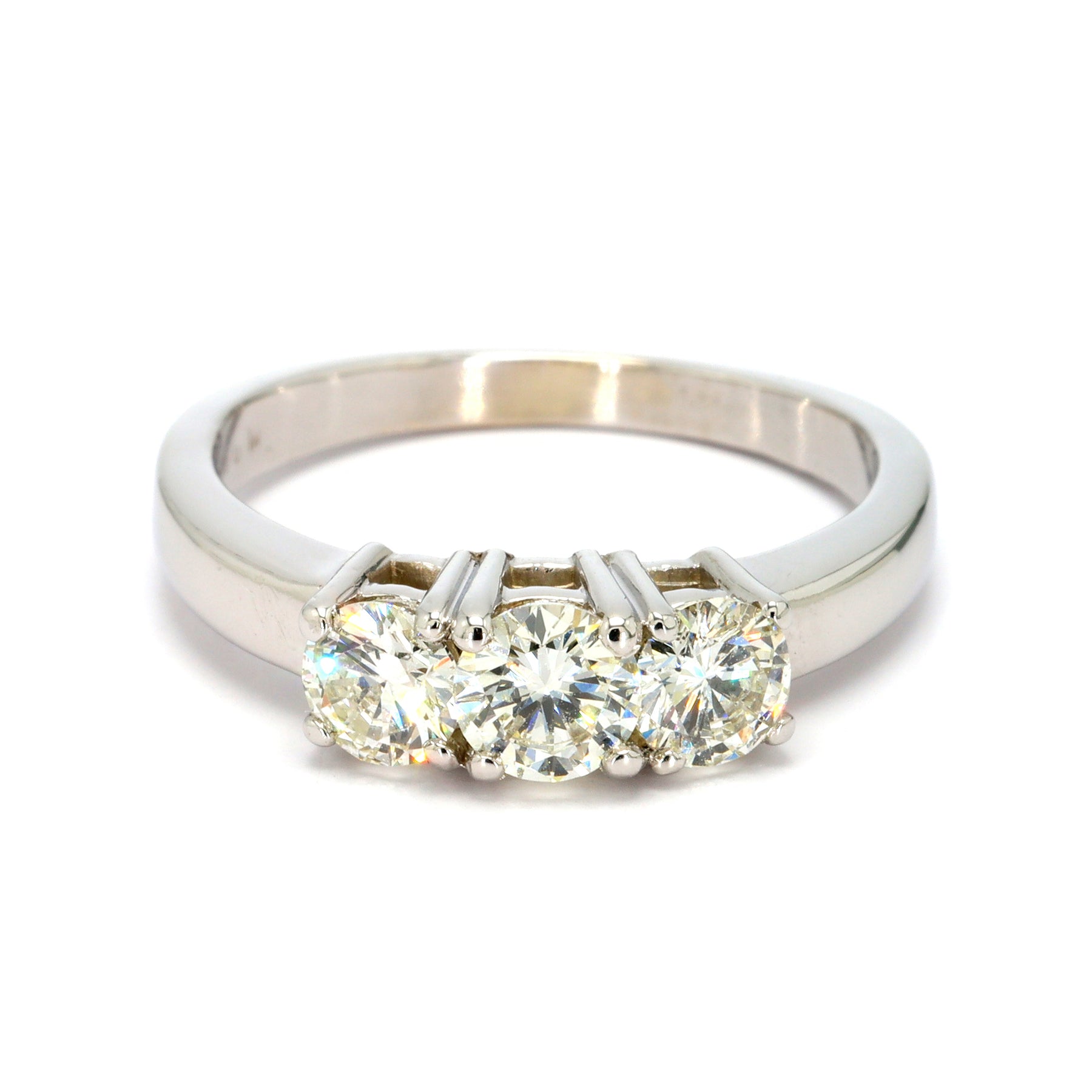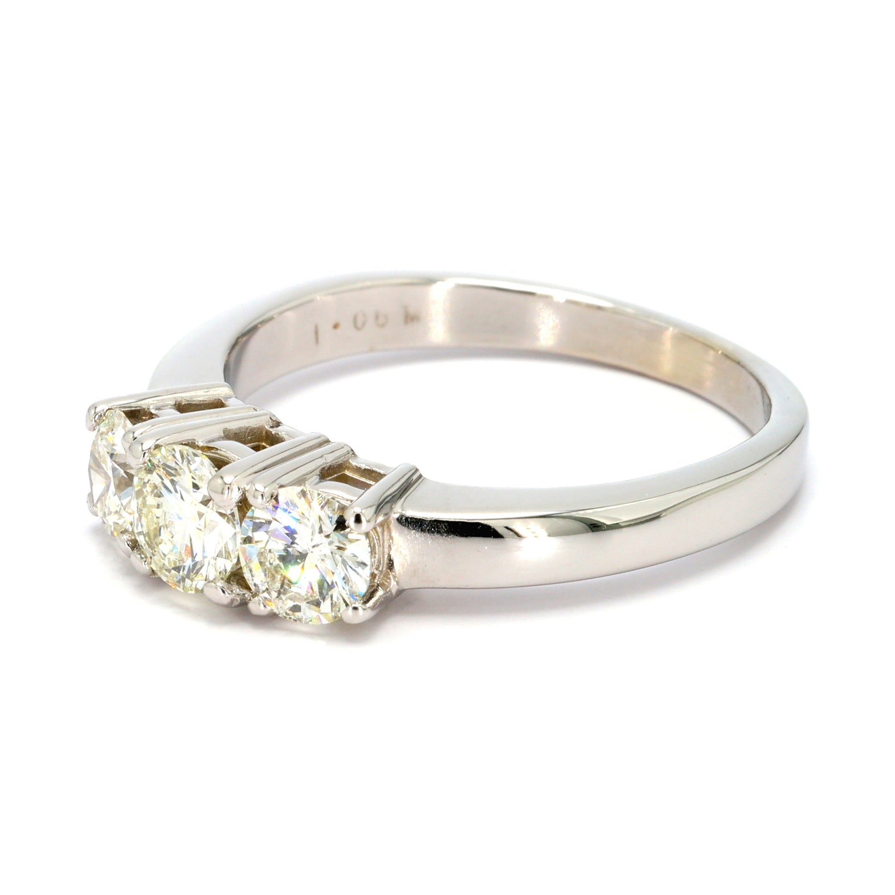 Three-stone engagement ring in 14-karat white gold featuring 3 diamonds with a combined weight of approximately 1.06 carats, size 7.25.