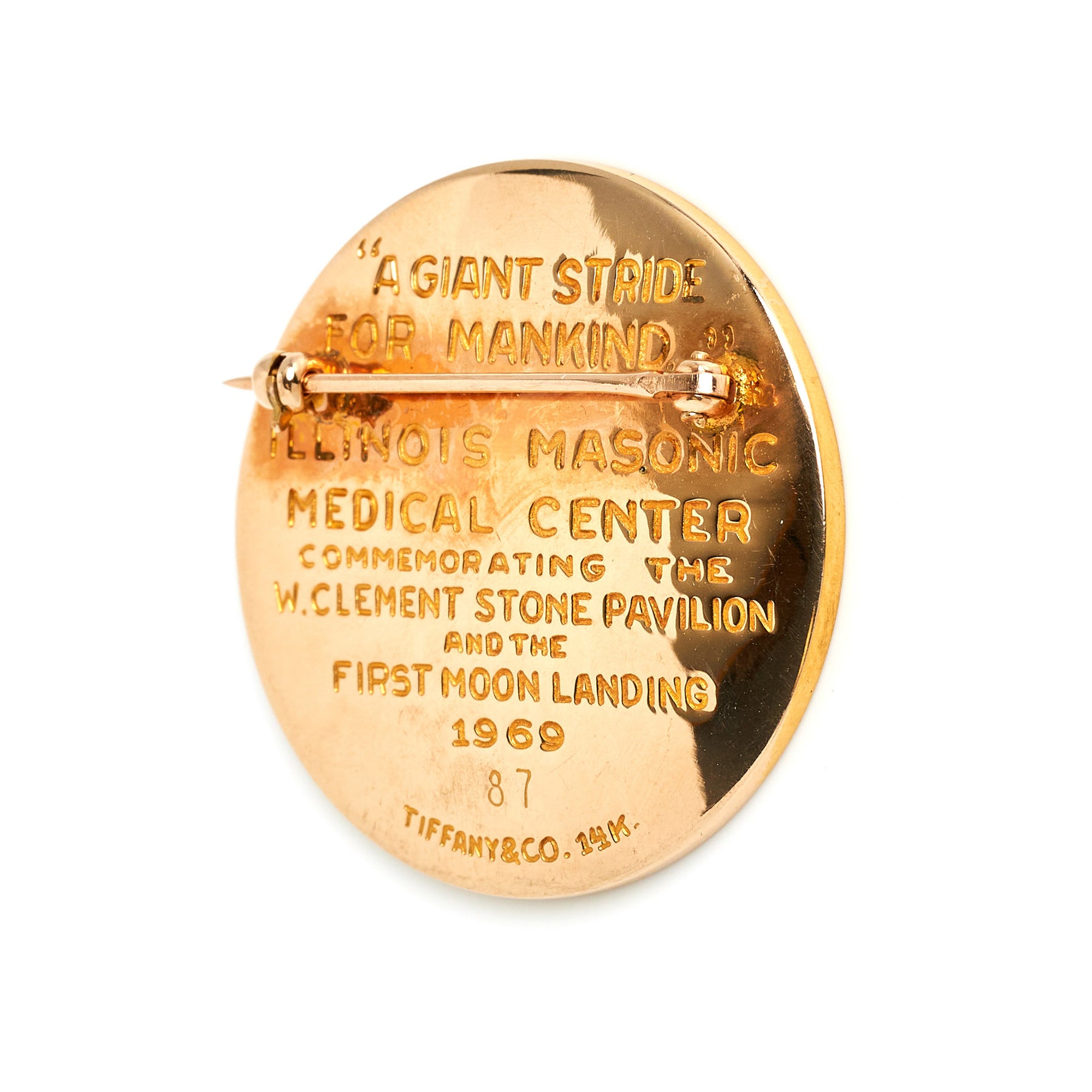 "Tiffany & Co." commemorative moon landing pin with blue enamel. The back reads, "'A giant stride for mankind.' Illinois Masonic Medical Center commemorating the W. Clement Stone Pavilion and the first moon landing 1969."