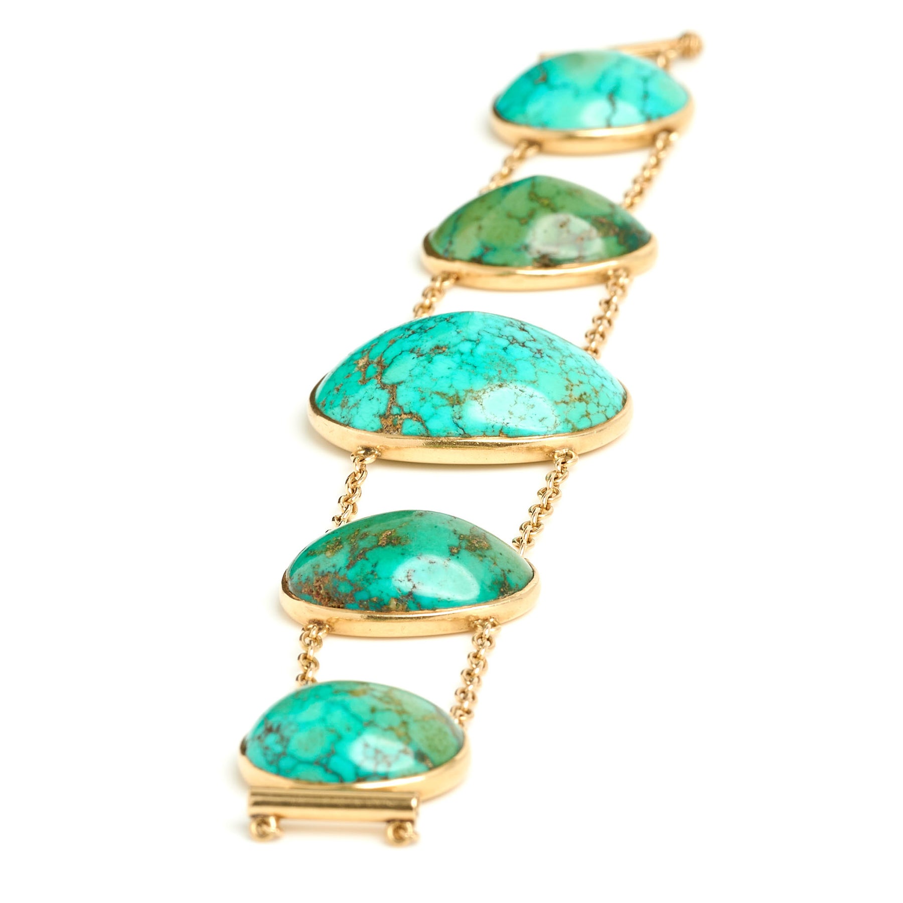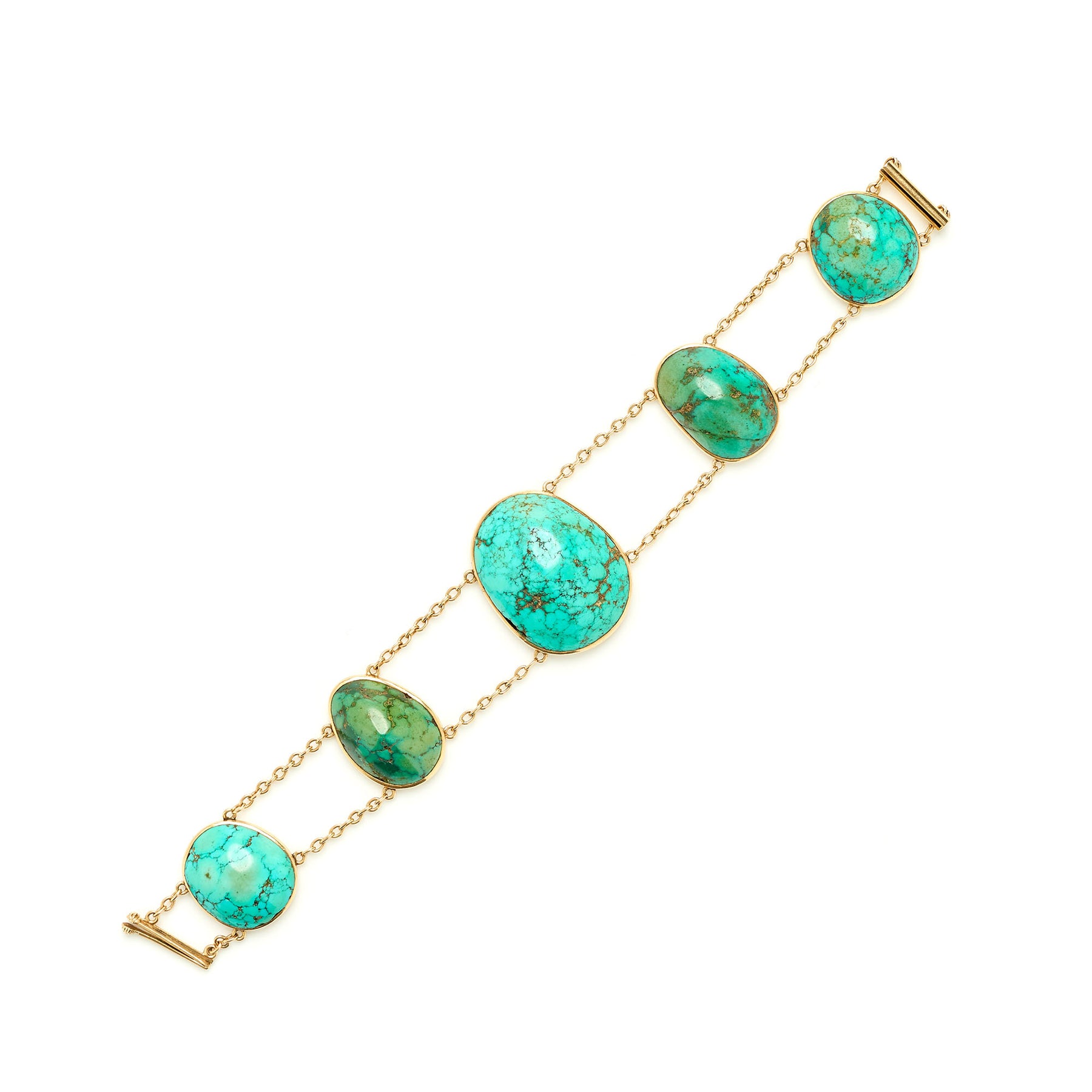 Art Nouveaux station bracelet, circa 1920, bear a mark attributed to Arizona Turquoise Mines Co. located in New York, New York (trademark found in a 1915 Jewelers' Circular Keystone Trademark publication), in 14-karat yellow gold, features 5 pieces of freeform-shaped turquoise.