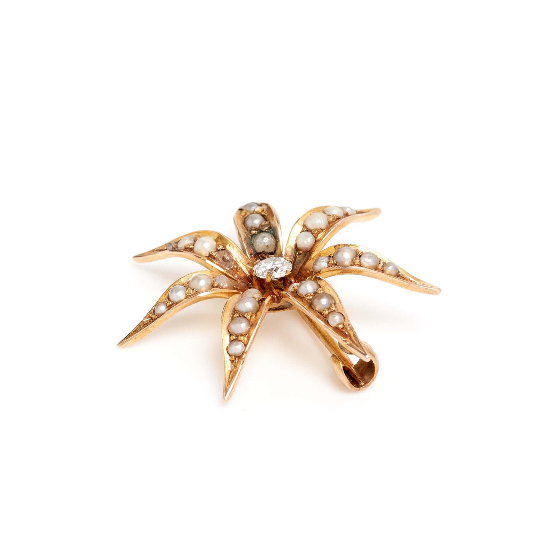 Victorian floral brooch in 10-karat yellow gold featuring 1 old European cut diamond weighing approximately 0.12 carats and half-pearls. One of the half pearls is missing, so this piece is sold *AS IS.*
