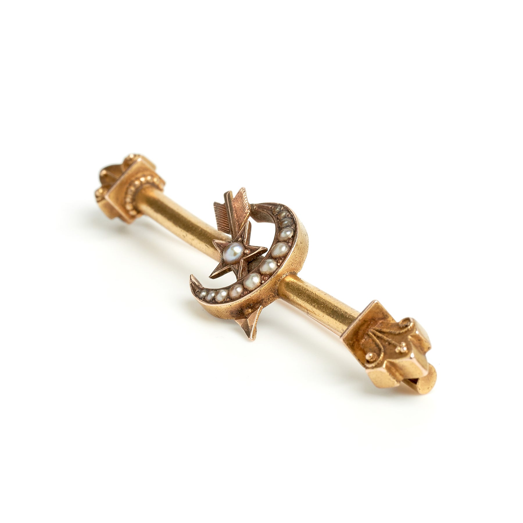 Victorian moon and shooting star pin in 14-karat yellow gold featuring seed pearls.